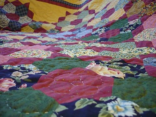 Diese ganzen kleinen Blümchen sind übrigens auch von Hand genäht bzw. gequillet - das sorgt für mehr Stabiliät nehme Ich mal an, sieht aber auch super schick aus. Der untere Teil der Decke ist übrigens eine dunkelrote Flauschedecke, das Quilltmuster sieht man da natürlich auch!